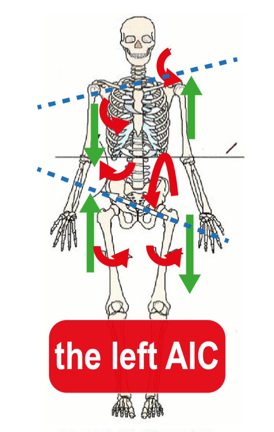 Kurz gesagt: das linke AIK-Muster ist ein Muster, bei dem unsere linke vordere innere Muskelkette ständig eingeschaltet ist (linke anteriore interne Kette = linke AIK, anterior = vorne). Dadurch wird das linke Becken im Vergleich zur rechten Seite in einer nach-vorne gedrehten Position gehalten.